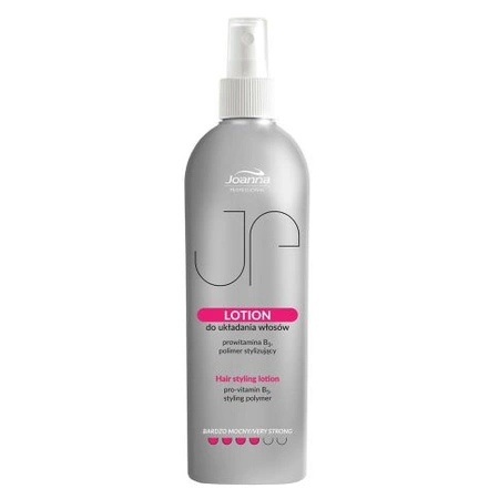 Lotion do układania włosów Joanna Professional został specjalnie opracowany do stosowania w salonach fryzjerskich. Przeznaczony jest do modelowania wszystkich rodzajów włosów, nadając im puszystość i połysk. Zawiera polimer stylizujący oraz pielęgnującą prowitaminę B5. Zwiększa trwałość fryzury, zachowując przy tym jej naturalność i lekkość.